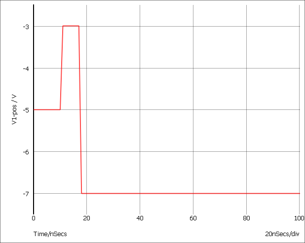 Both the above examples give a pulse lasting 5???MATH???\mu???MATH???S with a period of 10???MATH???\mu???MATH???S, rise and fall times of 100nS and a delay of 0. The voltage source has a 0V base line and a pulse of 5V while the current source has a 0mA base line and a pulse of 1mA.