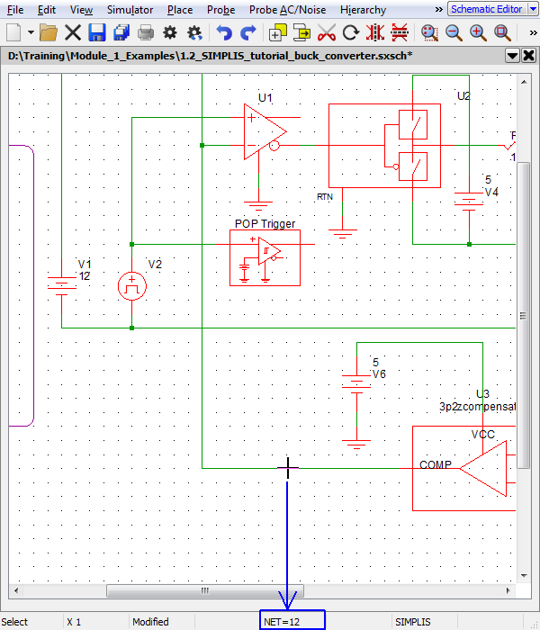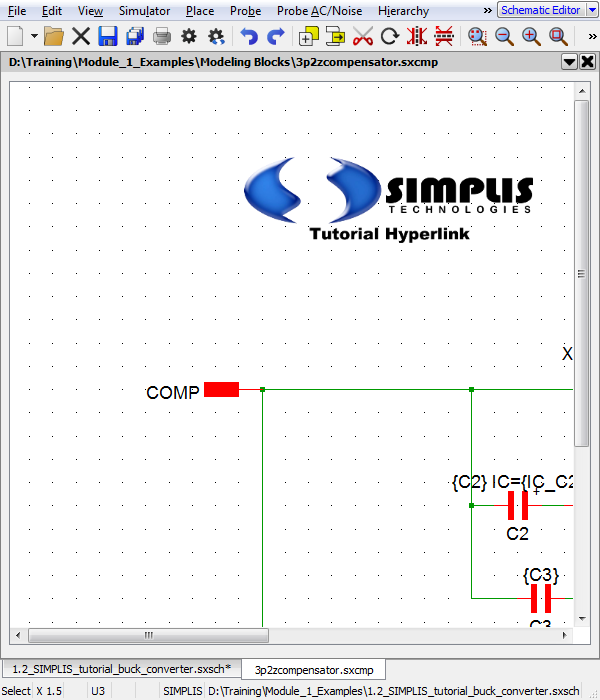The 1.2_SIMPLIS_tutorial_buck_converter.sxsch schematic contains one model implemented with a Schematic Component file, the compensator U3. To view the schematic for the compensator,