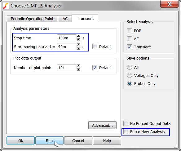 At first glance, the SIMPLIS transient analysis appear to be just like a SPICE transient analysis. Both simulators have start and stop time controls and a way to control the number of data points.