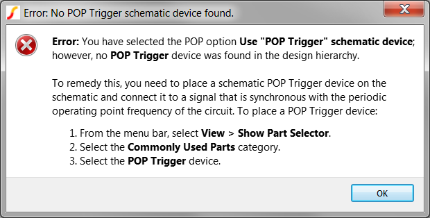 • The parameters set in the POP Trigger Source section are applied to all phases of the POP process. Checking the box Use "POP Trigger" schematic device tells SIMPLIS to look for the schematic POP trigger device in the design hierarchy, and if present, use that signal as the periodic indicator of the beginning of each new switching cycle. If the POP Trigger schematic device is not found in the schematic hierarchy, an error message is generated: