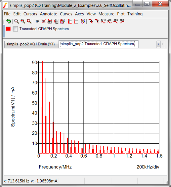 *** graphs a truncated frequency spectrum using the Spectrum function *** Exercise #1: comment out the above .GRAPH lines and options, uncomment the next three lines *.GRAPH "Truncate( Mag( Spectrum( :V1#P , 2^12 ) ) , 0 , 1.6Meg )" *+ axisType="auto" persistence=1 graphName="spectrum" curveLabel="Truncated .GRAPH Spectrum" *+ analysis="pop" xLog="auto" yLog="lin" nowarn=true xLabel="Frequency" yLabel="Spectrum(V1)" xUnit="Hz" yUnit="A"