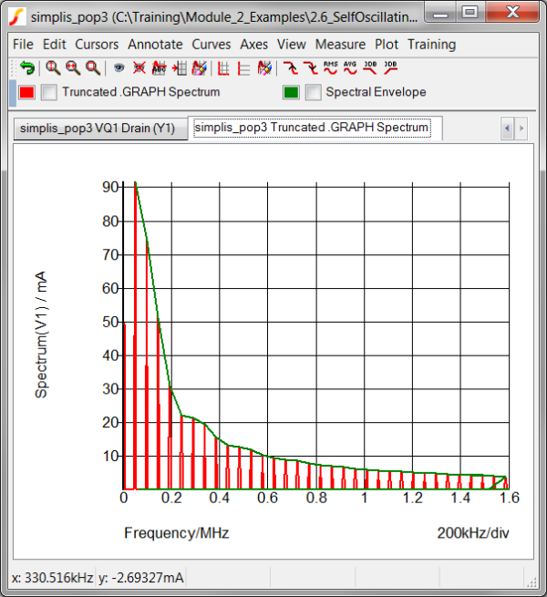 *** this .GRAPH statement adds a curve at the maxima of the spectrum *** Exercise #2: Uncomment the next three lines *.GRAPH "Maxima( Truncate( Mag( Spectrum( :V1#P , 2^12 ) ) , 40k , 1.6Meg ) )" *+ axisType="auto" persistence=1 graphName="spectrum" curveLabel="Spectral Envelope" *+ analysis="pop" xLog="auto" yLog="lin" nowarn=true xLabel="Frequency" yLabel="Spectrum(V1)" xUnit="Hz" yUnit="A"