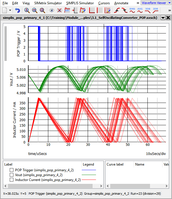 Note the seed value 1988583953 which was used for this run. In this converter, the switching frequency is highly dependent on the inductance value. Not unexpectedly, the evaluated parameter value for the inductance is higher than the default value, which requires longer charging and discharging times, and hence a lower switching frequency results.