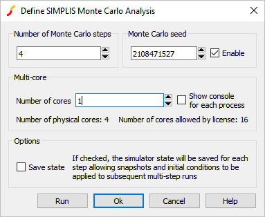 The SIMPLIS Monte Carlo Analysis is similar to the SIMPLIS Multi-Step Analysis except instead of stepping a parameter, the Monte Carlo seed value is stepped. The seed value is used to determine the values of each statistical distribution function used in the design. If no statistical distribution functions are used in the circuit, each seed value will produce identical simulation results.