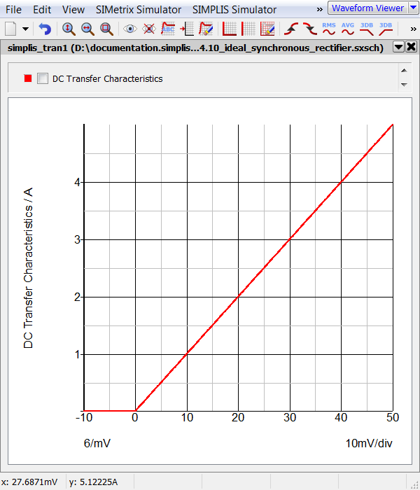 All semiconductor symbols used in SIMPLIS schematics call a electrical model which has PWL transfer characteristics. The model parameter extraction algorithms execute SIMetrix SPICE simulations on the SPICE model and curve fit a PWL model to the SPICE simulation curves. In contrast to the user-defined model in this exercise, a parameter extracted diode would have a forward voltage drop and three PWL segments, as opposed to the two segment model used in the user-defined diodes.