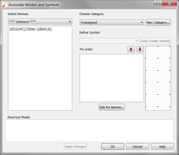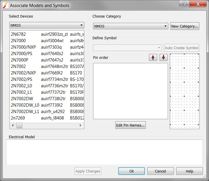The Associate Models and Symbols dialog allows you to change or create new categories, change symbols, and change the pin order. The Help button on the lower right hand corner of the dialog links to a comprehensive help topic.