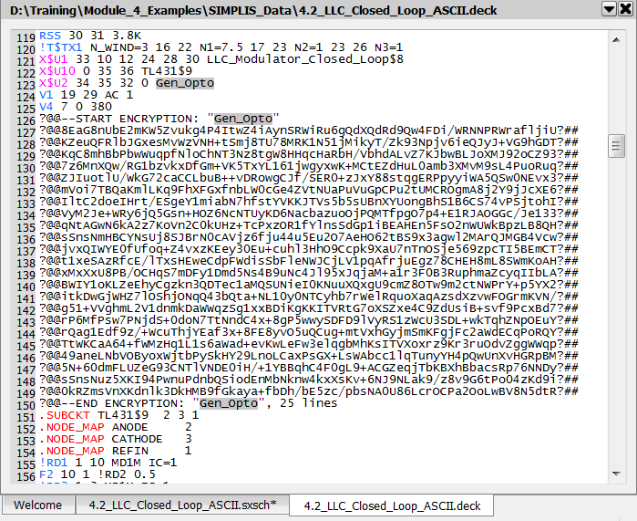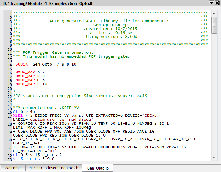 Notice that the files are identical up to line #22 where the encryption start tag is located. The encryptor reads the plain text Gen_Opto.lb library file and encrypts all text between the start and end tags, generating the encrypted model library file Gen_Opto_encrypted.lb.