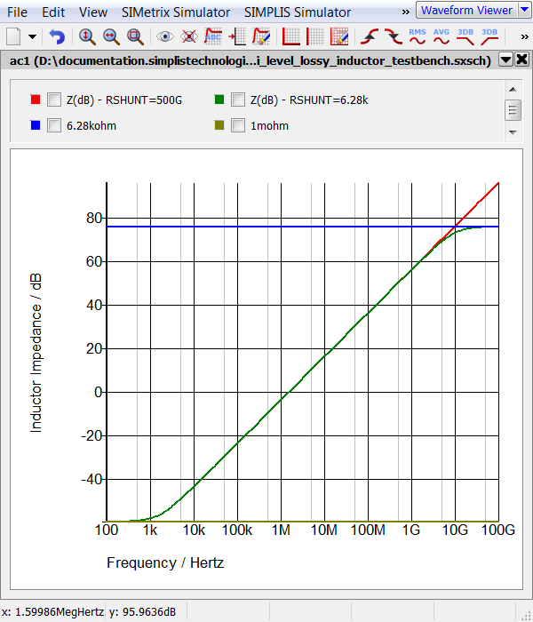 Notice the output waveforms from the two simulations are nearly identical, despite the different shunt resistance parameter values. When you changed the shunt resistance to 6.28kkΩ, you inserted a high frequency pole in the inductor impedance. As this pole is at approximately 10GHz, it has negligible effect at the frequencies present in the circuit. The image below depicts the impedance of the multi-level lossy inductor with RSHUNT=6.28k and RSHUNT=500G.