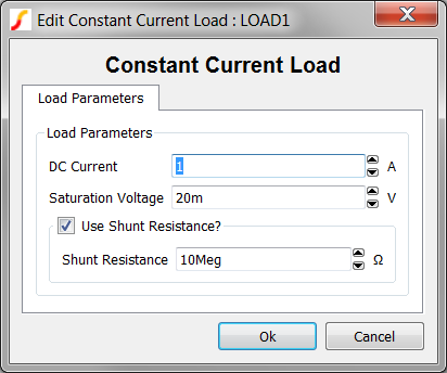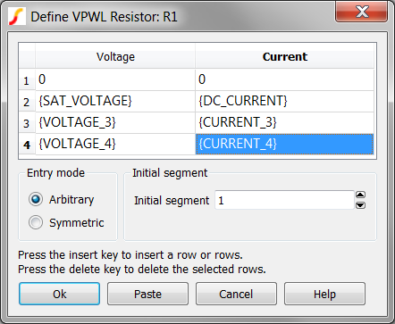In this part, you will define the PWL resistor points using parameter values. The constant current load requires four parameters which the user will enter on the parameter editing dialog. These parameter names and the default values are shown in the table below: