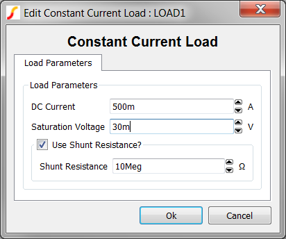 3. Change the DC Current value to 500m, and change the Saturation Voltage parameter to 30m and click Ok to accept the dialog. The dialog should appear as follows: