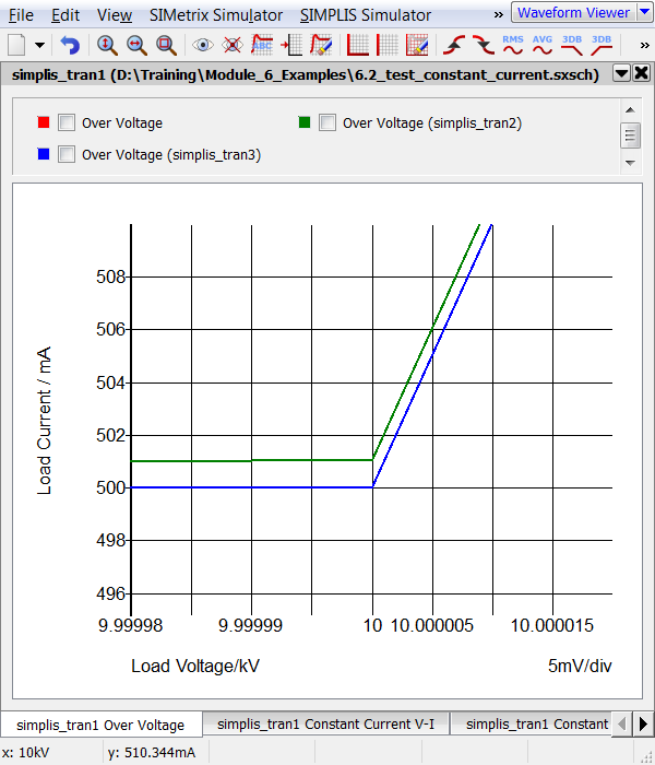 Result: The graph clearly shows the current at the 10kV point is approximately 501mA, which is the 500mA DC Current plus the shunt resistance contribution. The shunt resistance contributes 10kV/10MegΩ or 1mA to the load current at the load voltage of 10kV.