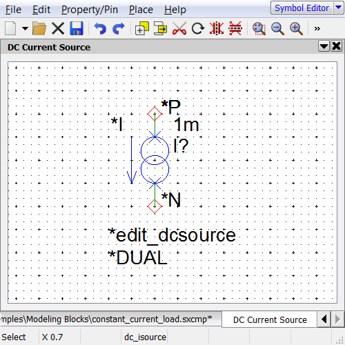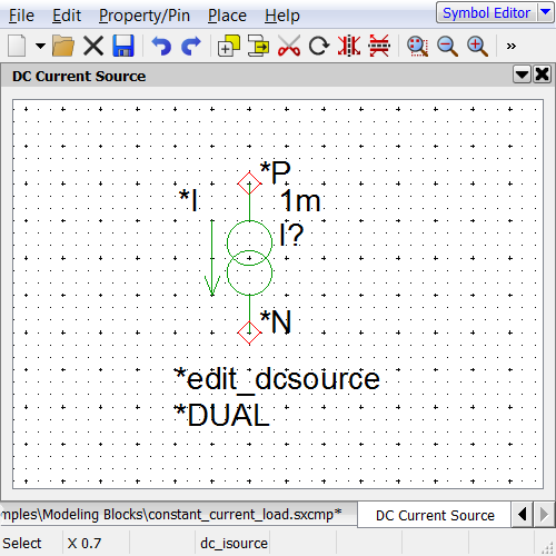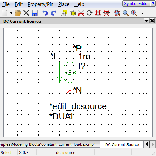 4. You now have both your schematic component symbol and the built-in DC Current Source symbol open in the symbol editor