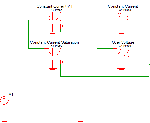 Result: The testbench schematic opens, this schematic has been specially prepared to test the load using four XY probes and a ramped voltage source. Each X-Y probe is configured to display one of the three PWL resistor operating segments.