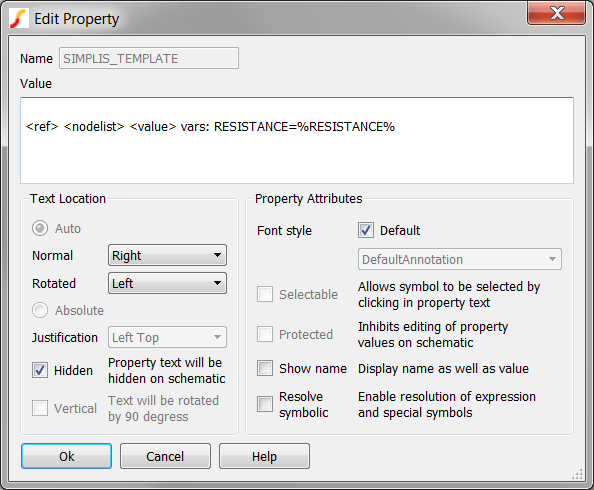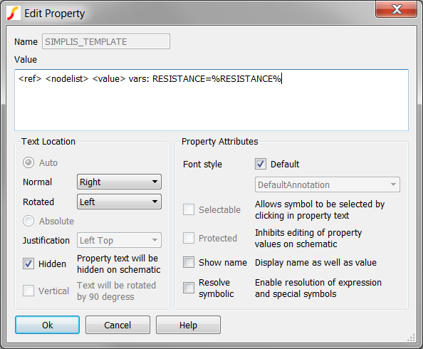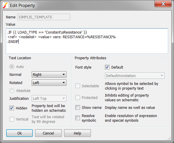 It is also important to remember that the SIMPLIS_TEMPLATE literally defines the netlist entry for a symbol. As such, you need to be very careful when editing the SIMPLIS_TEMPLATE property. In the above example, the SIMPLIS_TEMPLATE is spread out on three lines, and this is critical to the conditional expression evaluating correctly.