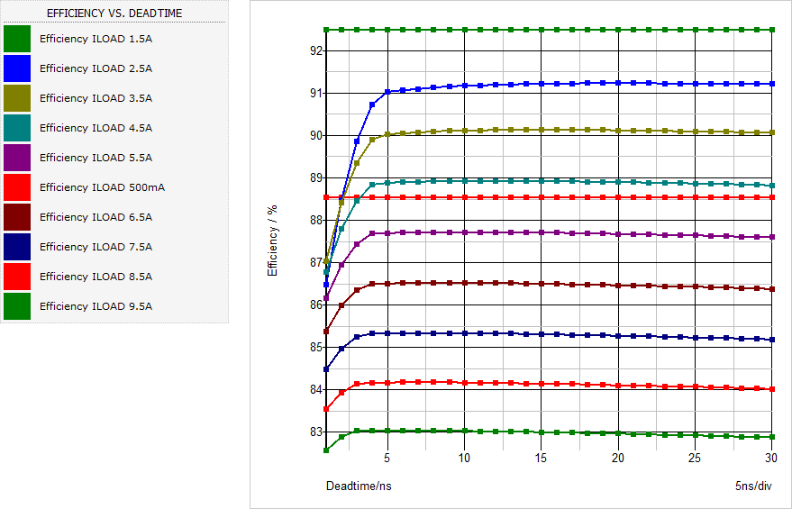 You can also "slice" the above data vertically by stepping the deadtime on the horizonal axis while the load current is the running parameter. In the graph below, the deadtime is stepped from 1ns to 30ns while the load current is stepped from 0.5 to 9.5A. The apps_d_4_efficiency_multi_step_step_deadtime_v_iload.testplan testplan was used to generate these curves.