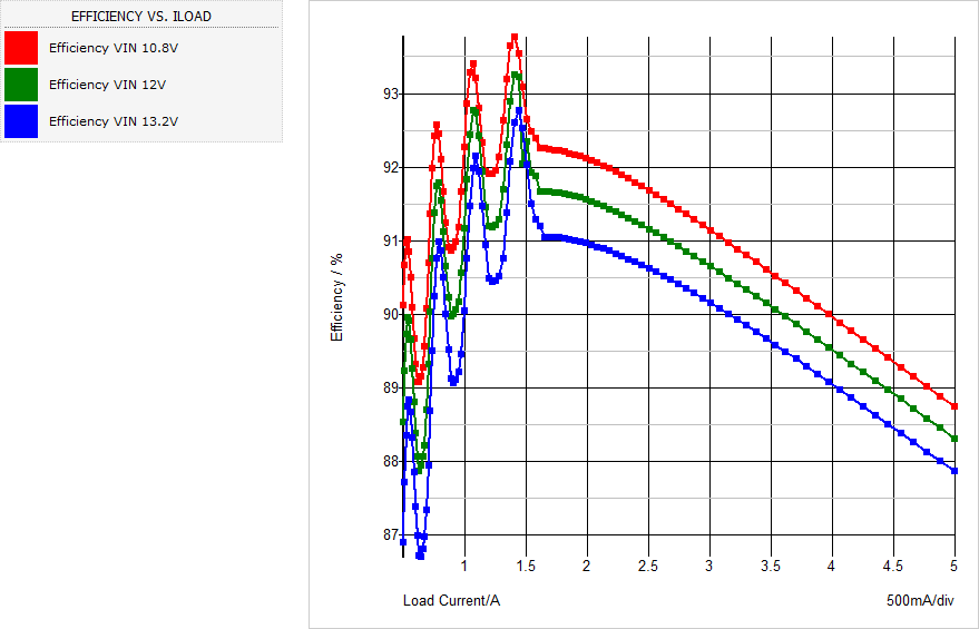 Before moving onto modifying the testplan to step the deadtime, a comment should be made on the number of data points used in these simulations. In the training course environment, users will have laptops with all sorts of processors and limitations - some computers will be very fast, others slow. For the purposes of demonstration during the class, we have chosen examples which simulate quickly. You should easily be able to modify these testplans to produce higher fidelity images, such as this one in which the ILOAD parameter was stepped from 0.5A to 5A in a decade sweep using 100 points per decade. The almost resonant effect seen in the low current efficiency is due to the discontinuous nature of the converter at light loads.
