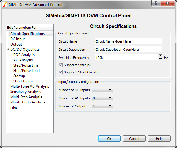 DVM sources and loads, then add a control symbol and edit the circuit specifications for