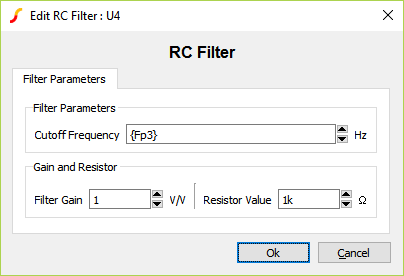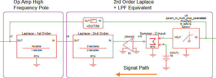 The Type III analog compensator has 3 poles and 2 zeros, therefore, a 3rd order laplace filter is needed. However, digital compensation networks require an anti-aliasing filter to be placed at its input. Therefore, we will remove one of the poles from the 3rd order laplace filter to use as an anti-aliasing filter. Thus resulting in a 2nd order laplace filter in series with a 1st order low-pass filter. Since the OpAmp in this example is not ideal, an additional 1st order laplace filter with 1 real pole at 700kHz and no zeros is used to model the high frequency behavior of the OpAmp. The equivalent filter schematic is shown below: