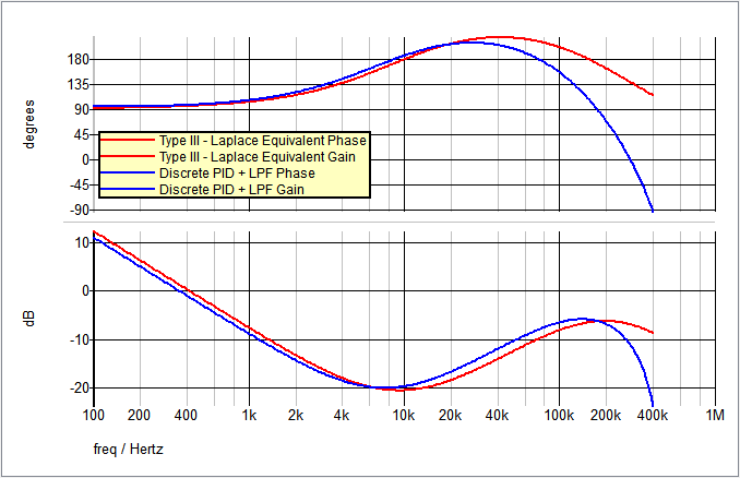 The AC results of the Type III Laplace Filter equivalent (from Step 1) and the new discrete time filter compensation are compared here: