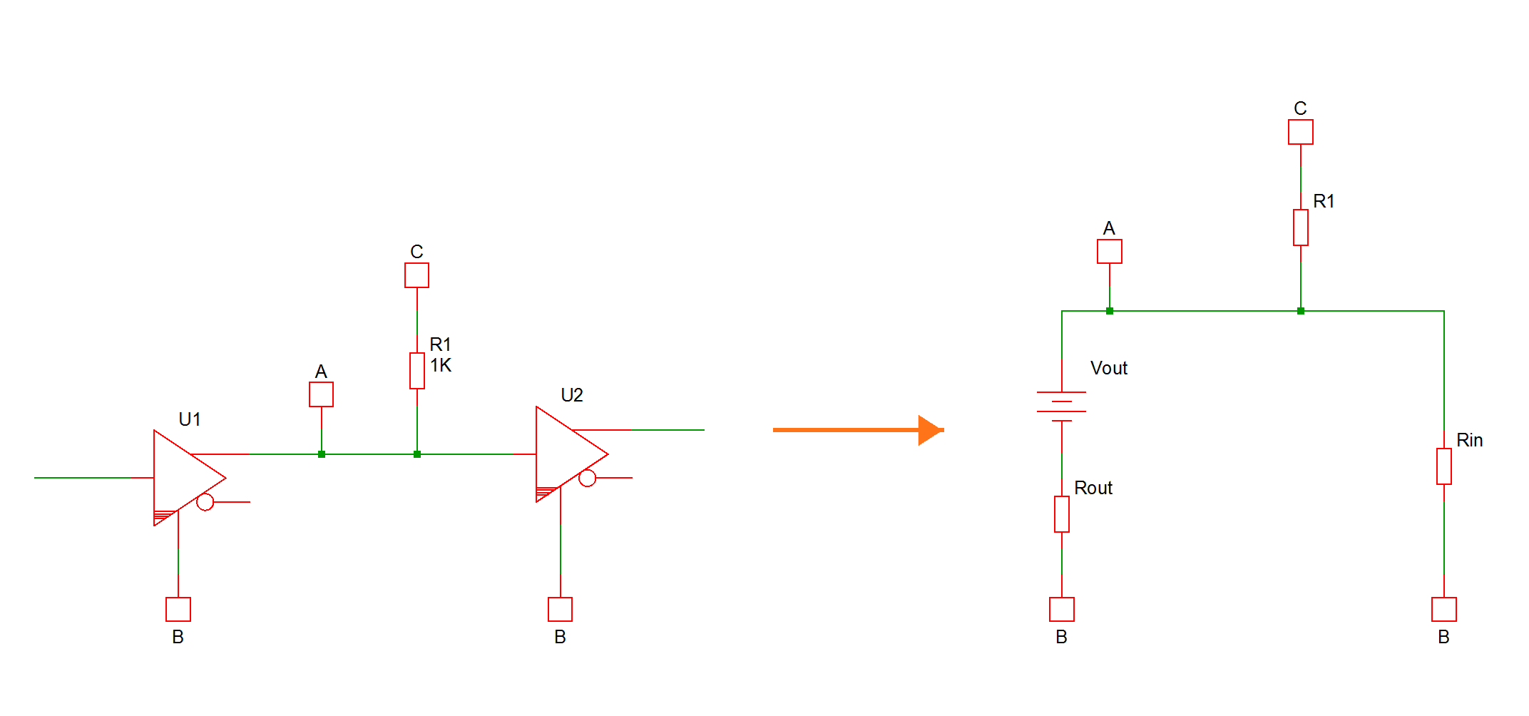This simple circuit could be part of a much more elaborate schematic with many other components. Obviously, node A is an analog node due to the connection to the resistor R1. On the analog side of SIMPLIS, the output of U1 here is represented by a series connection of a resistor Rout with a DC voltage source Vout. On the analog side of SIMPLIS, the input of U2 is presented by a resistor Rin to represent the input resistance.