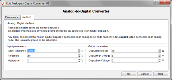 To define the parameters for the interface between this digital component and each analog component connected directly to an input or output pin, follow these steps: