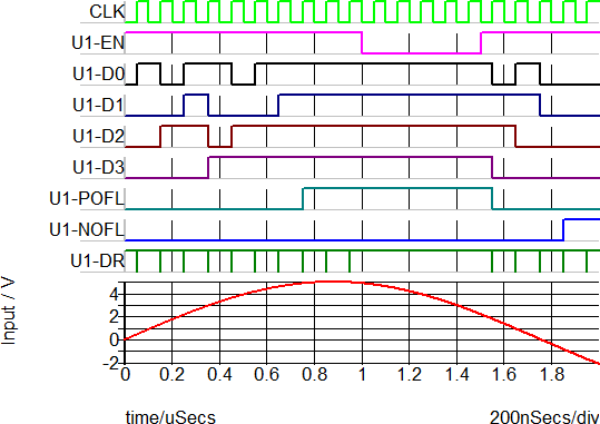 The waveforms below show the ADC operation with a sine-wave input.