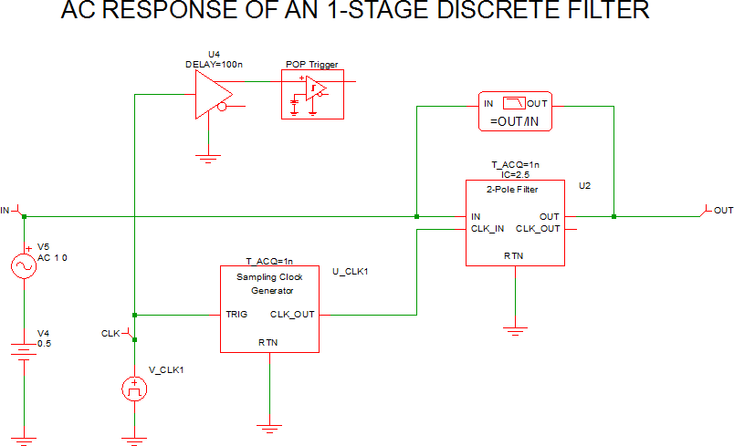 The POP waveforms below show that the DC input voltage to the filter is 0.5V and the DC output voltage is 2.5V, confirming that the DC gain of the 2nd order discrete time filter is 5.