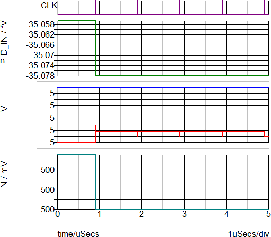 The POP waveforms below show the steady state operation of the PID filter. The PID input, PID_IN , is forced to nearly zero by the external feedback components and the high integral gain of the PID Filter. The middle grid has both the PID_OUT and OUT_LP curves, and both are at the steady state voltages of 5V. The bottom-most curve representing the input voltage, IN , is at the DC setpoint of 0.5V.
