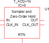 The Sampler and Zero-Order Hold models an analog sample and hold. On each clock edge, the input voltage is sampled and held until the next clock edge. As with the other devices in the Discrete Time Filter category, the Sampler and Zero-Order Hold is compatible with the SIMPLIS POP and AC analyses.