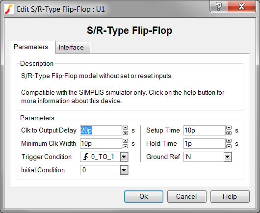 The S/R Flip-Flop models a generic clocked S/R Flip-Flop. The Q and QN outputs can change state only on the specified clock edge. The clock edge trigger can be set with the Trigger Condition parameter to be either rising edge ( 0_TO_1 ) or falling edge ( 1_TO_0 ). The S/R Flip-Flop has no set or reset inputs. For the S/R Flip-Flop with set and reset inputs, see the S/R Flip-Flop with Set/Reset.