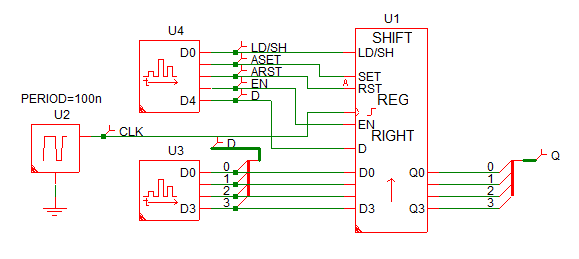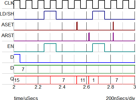 The image below shows the load and shift behavior when the D input is 0. For a right shift, the D input is shifted into the MSB; since D=0, the new Q output is half the old Q. The initial condition of the right shift register is set to 15 decimal in the example.