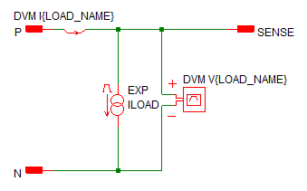 The Pulse Load - Single Current Pulse w/ Exponential Decay subcircuit models a single exponential decaying pulse current load. In DVM, this load is not used in any test objectives, but you can set a load to use this subcircuit with an Exp() call in the Load column of your testplan.