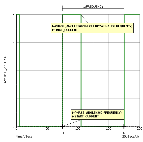 In this example the PHASE_ANGLE parameter is set to 270, and the OFF_UNTIL_DELAY is set to 1; therefore, for simulation times less than the time delay defined by the PHASE_ANGLE parameter, the load current is 1A, which is the value of the START_CURRENT argument.