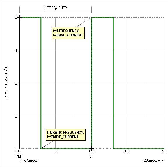 Since the TIME_DELAY parameter is set to zero, the pulse waveform begins with the FINAL_CURRENT value of 5A at t=0.