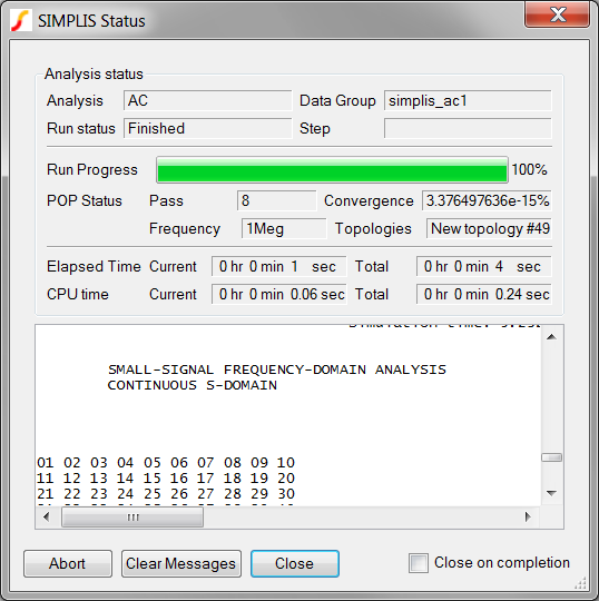 SIMPLIS simulation engines, analysis directives, component values, and other test