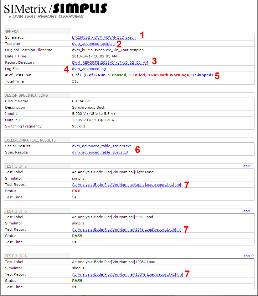 During each test, DVM measures scalar data, such as the converter phase margin, and compares these scalar results with the specifications stored in the DVM control symbol. Each test is assigned a PASS/ FAIL status based on these comparisons. If the same tests were selected as in the example, the overview report should show one test failure due to the minimum phase-margin specification. In the image below, the overview report has been annotated to highlight the common data elements of the overview report.