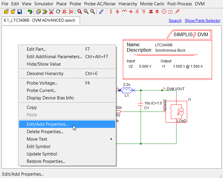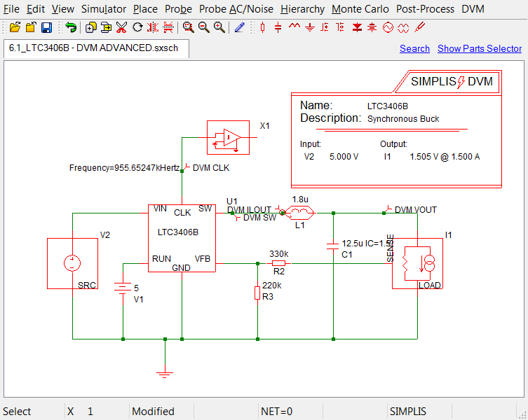 When one of the tests in lines 12-14 of the testplan above runs on the schematic, LTC3406B/6.1_LTC3406B - DVM ADVANCED.sxsch, the values on the schematic change from the variable names {L1_val} and {C1_val} to the values in the testplan, 1.8u and 12.5u. The variable statements in the F11 window are deleted, and the schematic is configured as the one below which is available from SIMPLIS_dvm_tutorial_examples.zip at this path:
