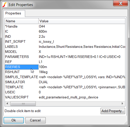 Both symbols and hierarchical components can have multiple properties. For example L1 is a lossy inductor defined as a subcircuit. The lossy inductor model has properties for the shunt and series resistances as well as the inductance.