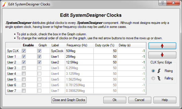 | Enable | CheckBox | Enables each clock. Disabled clocks are not included in the simulation. |