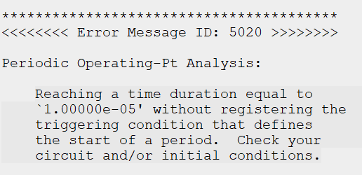 With the given input and output conditions and component values of this example schematic, the LLC converter is running at a switching frequency of 86.8 kHz, giving a switching period of 11.52 µs. The Maximum Period in the Periodic Operating Point tab of the Choose SIMPLIS Analysis dialog is purposely set to 5 µs, which is a value that normally would have led to the error message of:
