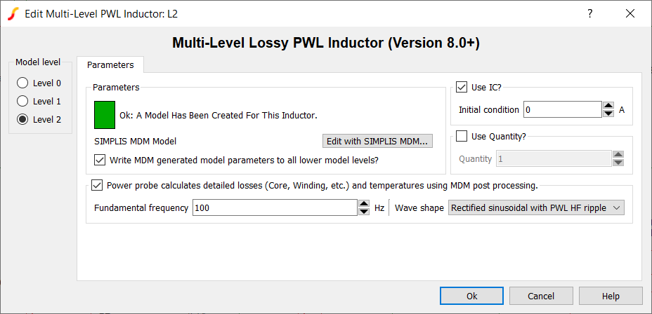 You will notice in the above schematic that inductor L2 has been marked for MDM post-processing and therefore contains a Level 2 model. Double click the symbol L2.