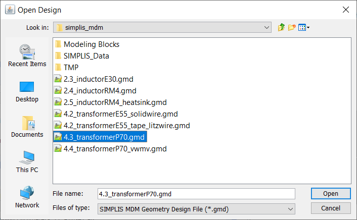 3. The Open Design dialog shows up. Navigate to the directory where you extracted the zip archive of schematic files, and select the file 4.3_transformerP70.gmd:
