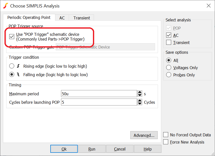 It is customary to specify the schematic POP trigger device when running a POP analysis. This is a selection in the Choose SIMPLIS Analysis dialog box as shown below: