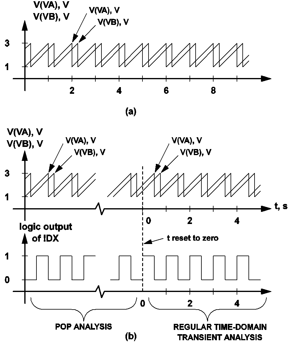 10.5 (a) Waveforms of two periodic sawtooth voltage sources VA and VB when no periodic operating point analysis is carried out, and (b) Waveform of the same voltage source when a periodic operating point analysis is carried out. The start of a switching cycle is defined as occurring when the output of the logic gate !DX is making a 0 to 1 transition. |