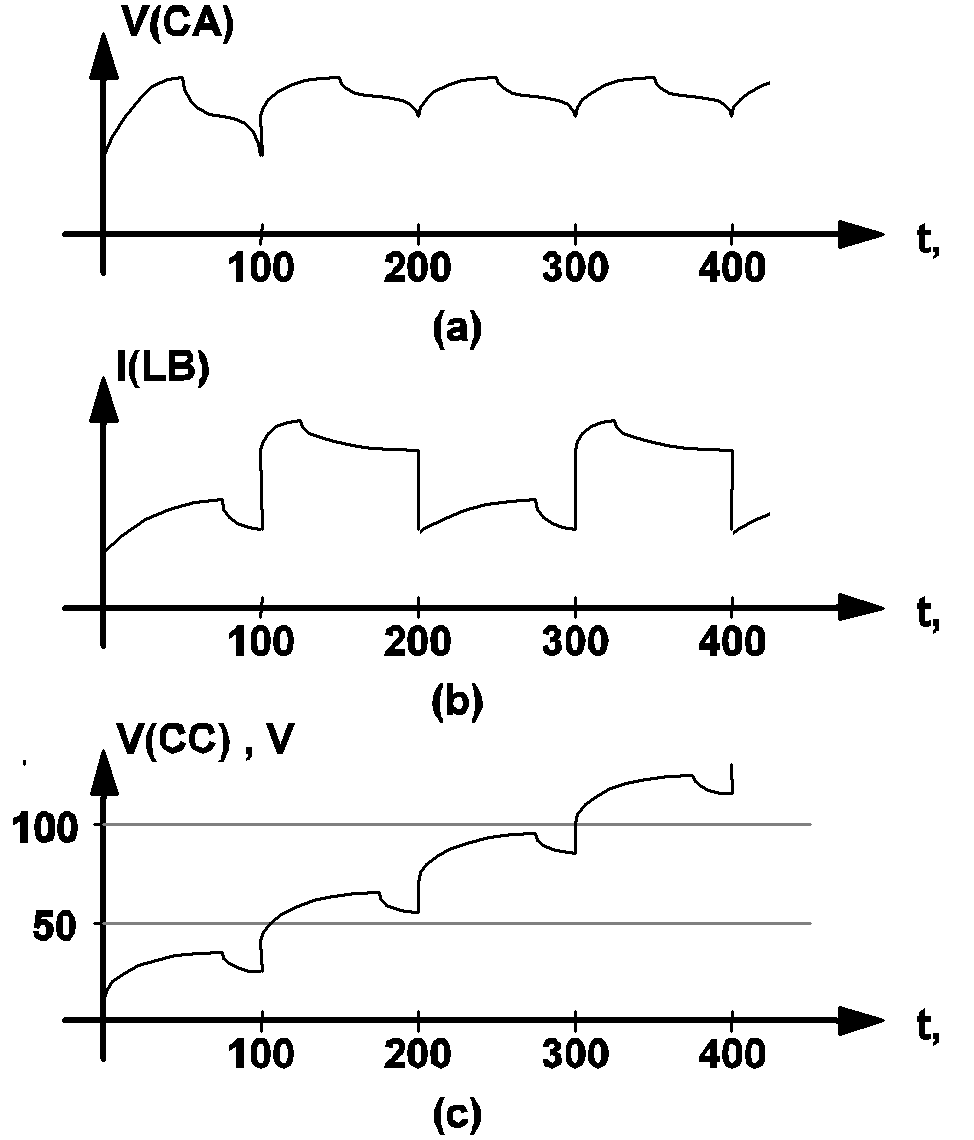 A typical waveform plotted from the "XXXX.t4" data file for a successful POP analysis is shown in fig 10.6 (a). The switching frequency for this example is 10 kHz and discontinuities in the waveform are observed at intervals of 100 microseconds. Typical waveforms plotted from the "XXXX.t4" data file for unsuccessful POP analyses are shown in fig 10.6 (b) and fig 10.6 (c). The waveform in fig 10.6 (b) is representative of a high-gain closed-loop regulated system where a small change in the capacitor voltages or inductor currents can cause a dramatic change in the mode of operation of the system. In such a case, the user may want to run a regular time-domain transient analysis until the system settles to a stable mode of operation, read off the capacitor voltages and inductor currents, and then run a POP analysis with the new initial conditions. The waveform in fig 10.6 (c) is representative of a system where the initial conditions for a few devices as supplied by the user in the input file are very far away from the values that they should be during steady-state operation. For instance, the waveform in fig 10.6 (c) suggests that, to approach steady-state operation, the initial condition associated with the capacitor CC should be increased to at least 100 V. Although the example waveforms shown in fig 10.6 are either capacitor voltages or inductor currents, all voltage and current variables specified in the .PRINT statement are generated in this data file for the user to examine the progress of the POP analysis.