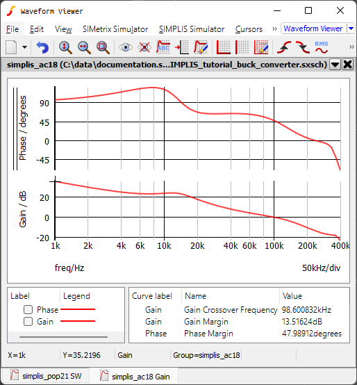converter is output to the waveform viewer. The Gain Crossover Frequency is 98kHz, the