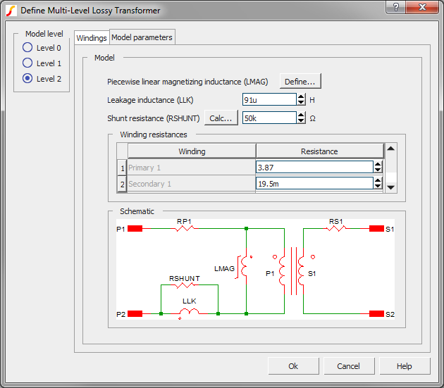 | Shunt resistance (RSHUNT) | Ω | The shunt resistance across the leakage inductance. The shunt resistance limits the high frequency behavior of the leakage inductance. Click the Calc... button to calculate the shunt resistance based on the leakage inductance value and the desired highest frequency. |