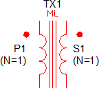 The parameters on the windings tab define the number of primary and secondary windings, the number of turns for each winding, and the "dot" polarity of each winding. You can edit the winding names on this tab, and the winding names will be copied to the Parameters tab on the dialog. For model levels 0-2, the number of turns on the dialog can be parametrized. For the level 3 model, the number of turns must be an integer value - no parameterization is allowed. The transformer symbol is re-drawn after you accept the dialog using the number of primary and secondary windings. For this reason, the number of primary and number of secondary windings cannot be parametrized.
