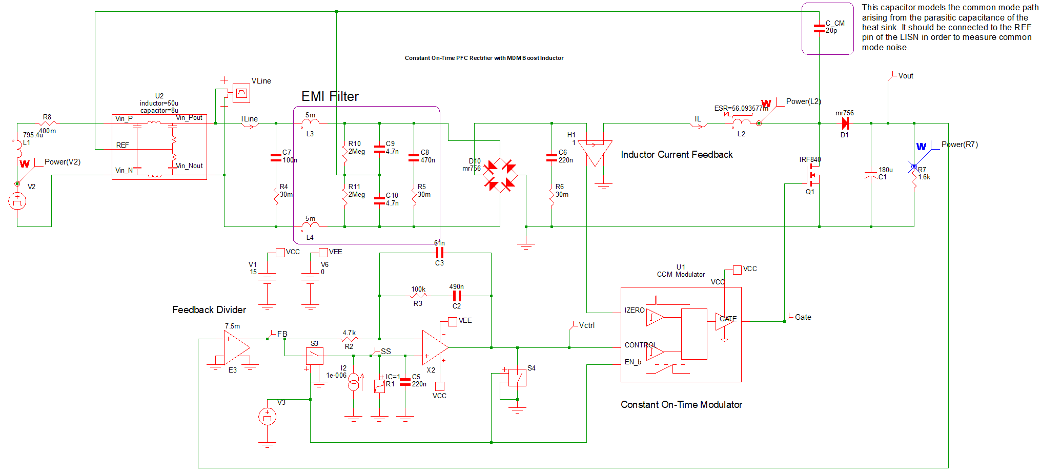 A PFC rectifier with AC line input, a LISN, and an EMI filter is provided in the schematic simplis_085_lisn_mdm_pfc_boost_inductor.zip. As the rectifier is connected to the AC mains, the LISN is configured to have a 50 µH inductor, and to show measured conducted EMI compared against the built-in CISPR32 Class B standard for consumer electronics. The schematic is configured to run a transient simulation.