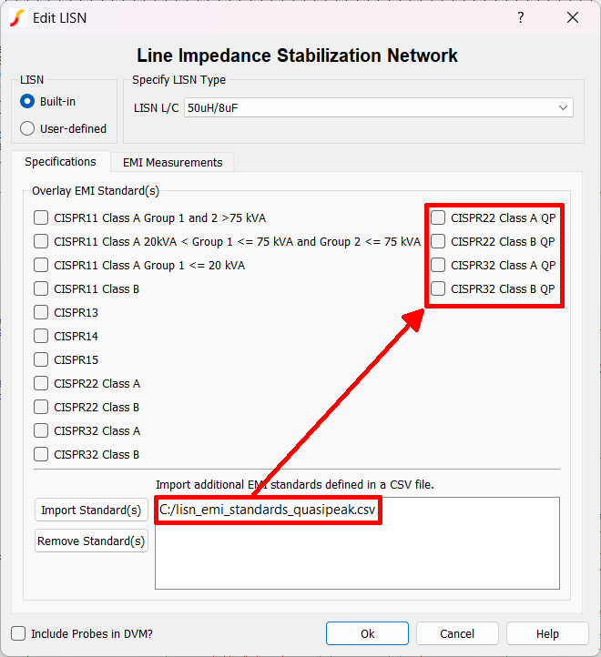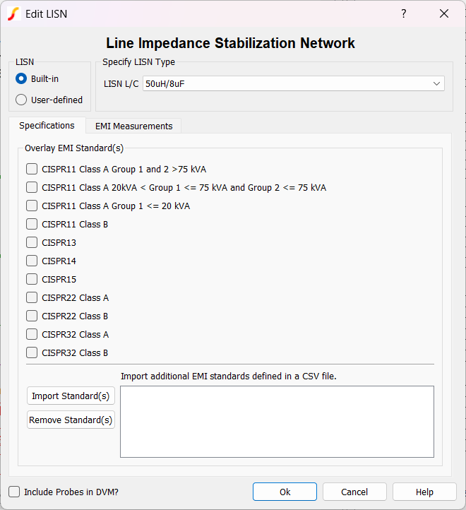 Selecting the Include Probes in DVM? checkbox will prepend "DVM" to all probes located in the LISN.